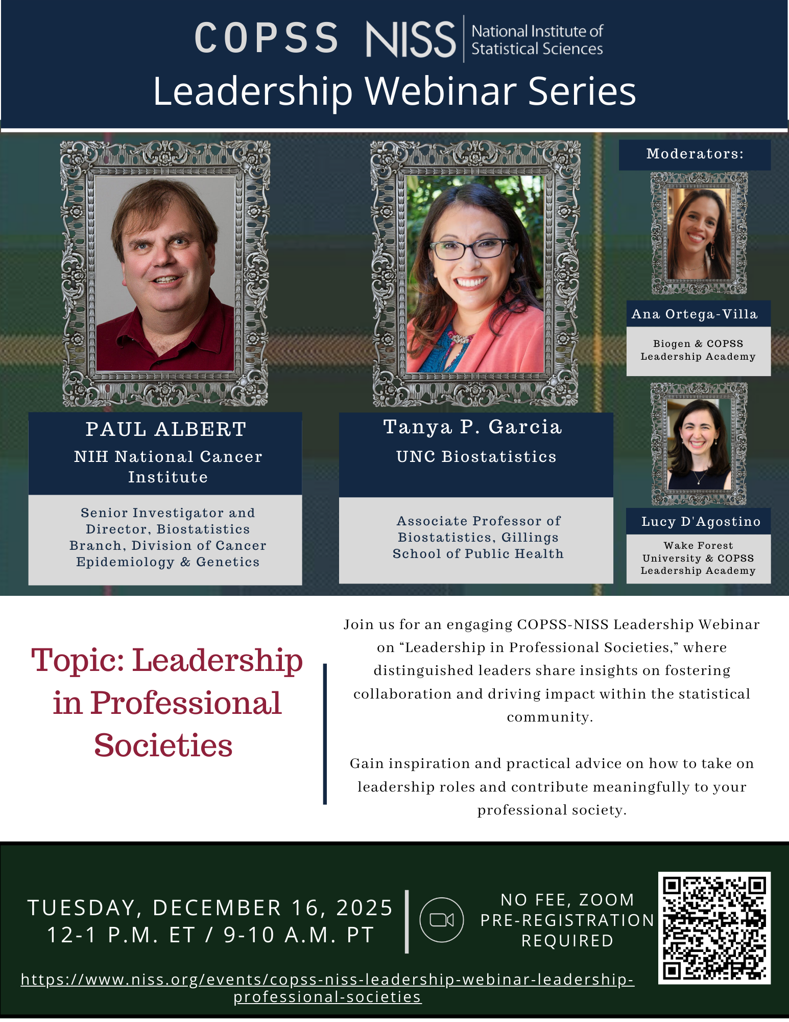 Join us for an engaging COPSS-NISS Leadership Webinar on “Leadership in Professional Societies,” where distinguished leaders share insights on fostering collaboration and driving impact within the statistical community. Gain inspiration and practical advice on how to take on leadership roles and contribute meaningfully to your professional society.